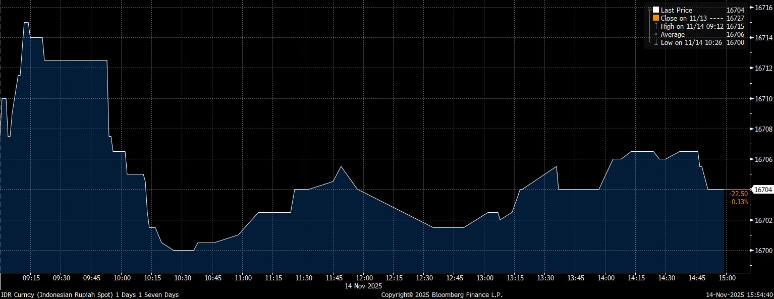 Di pasar spot, rupiah ditutup menguat 0,13% ke Rp16.704/US$. Sedang rupiah JISDOR ditutup menguat dengan kenaikan nilai sama 0,13% ke Rp16.710/US$ hari ini, Jumat (14/11/2025).