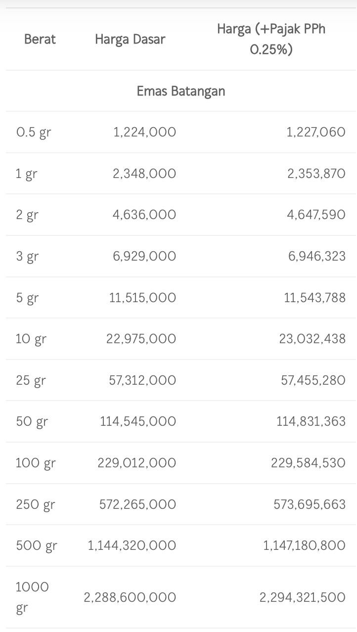 Berikut daftar lengkap harga emas Logam Mulia Antam untuk hari ini: