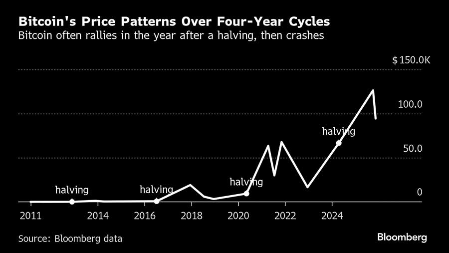 Di arena perdagangan dan media sosial, kecemasan mulai menyusup. Para trader mengulangi grafik lama, mengais teori-teori yang sudah dikenal, dan mencari pembeli. Tanpa panduan tradisional Wall Street tentang bagaimana Bitcoin seharusnya berperilaku — tanpa korelasi stabil, tanpa kerangka risiko yang teruji — beberapa orang kembali ke model yang mereka kenal terbaik: siklus pemotongan setengah empat tahun atau halving.