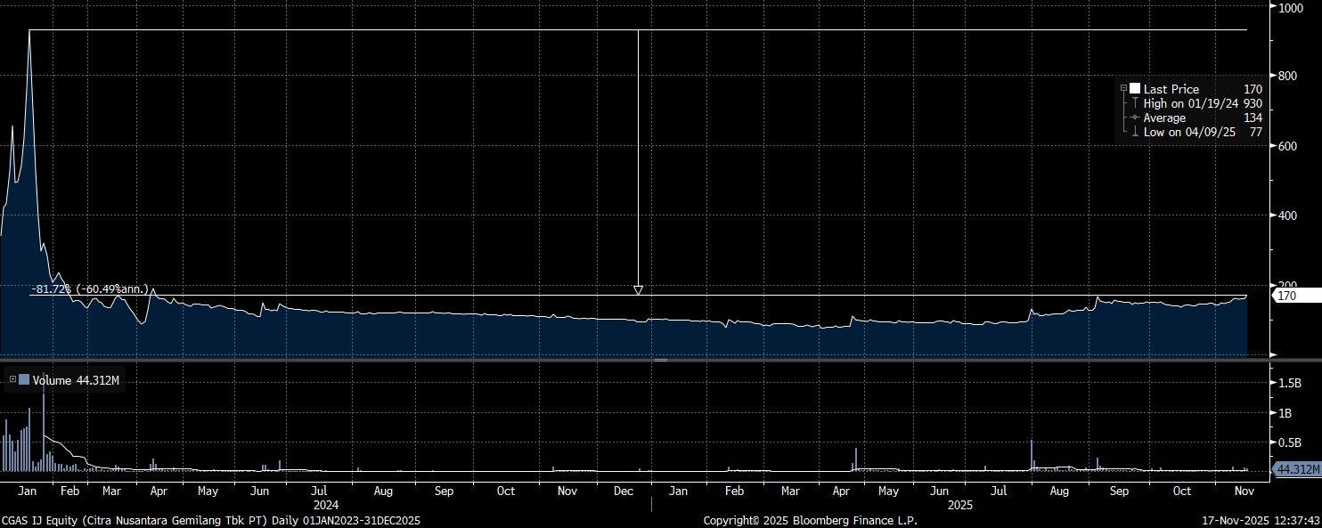 Bloomberg Technoz, Jakarta - Harga saham emiten energi pionir gas alam terkompresi (compressed natural gas/CNG) di Indonesia, PT Citra Nusantara Gemilang Tbk (CGAS) terus melanjutkan tren turun, dengan konsistensi melemah dari puncaknya pada Januari tahun lalu hingga perdagangan hari ini Senin (17/11/2025).