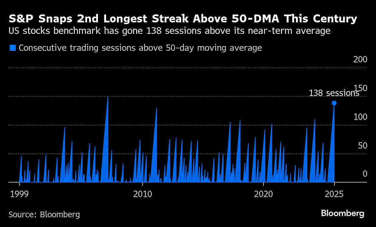 Indeks S&P 500 turun 0,9% dan diperdagangkan di bawah 6.700, mengakhiri rekor kemenangan selama 10 pekan pada setiap hari Senin. Indeks acuan ini juga mengakhiri 138 sesi perdagangan di atas rata-rata pergerakan 50 harinya — periode terpanjang kedua abad ini, menurut data Bloomberg. Pelemahan terjadi secara menyeluruh: lebih dari 400 saham turun, sementara kurang dari 100 menguat.