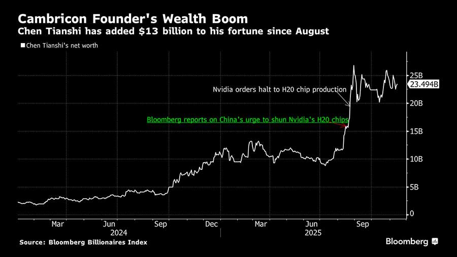 Saham Cambricon — dan secara tidak langsung kekayaan bersih Chen — melonjak pada Agustus ketika Beijing mendesak perusahaan lokal untuk menghindari penggunaan prosesor H20 milik Nvidia Corp., terutama untuk proyek terkait pemerintah.