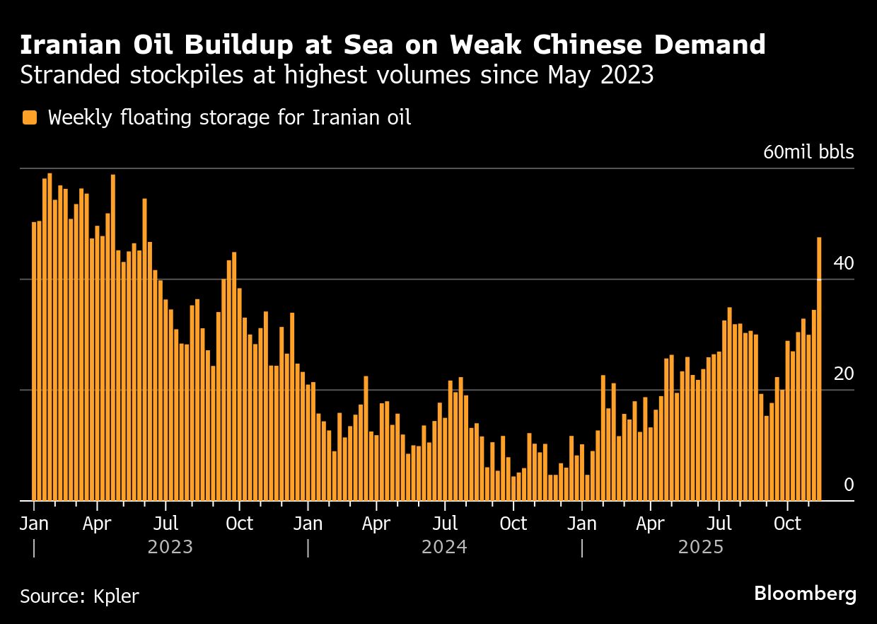 Akibatnya, volume minyak Iran yang disimpan di laut meningkat menjadi hampir 48 juta barel pada akhir pekan lalu, tertinggi dalam lebih dari dua tahun, menurut Kpler.