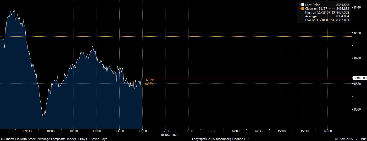 Bloomberg Technoz, Jakarta - Indeks Harga Saham Gabungan (IHSG) ditutup di zona merah dengan melemah 0,38% ke level 8.384,58 pada Sesi I Selasa (18/11/2025). Bertolak belakang dengan pembukaan pagi tadi imbas saham–saham energi, saham AADI dan INDY misalnya, jadi pemberat IHSG.