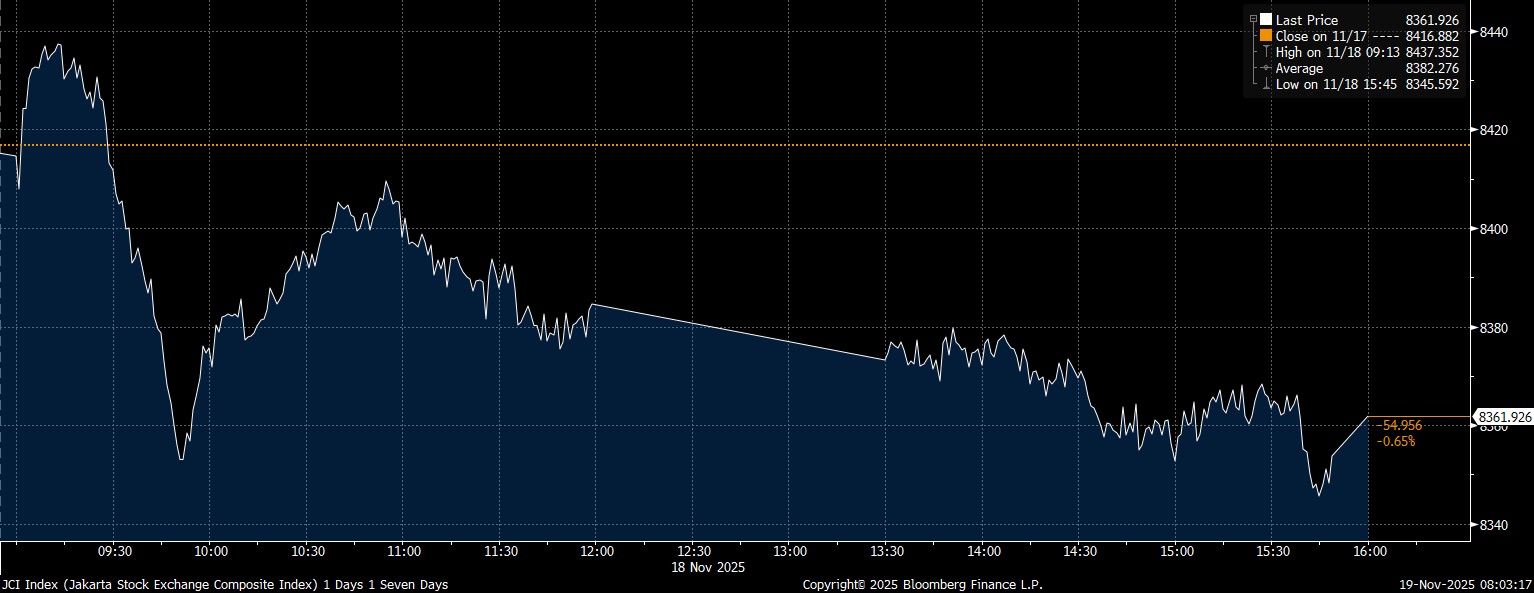 Bloomberg Technoz, Jakarta - Indeks Harga Saham Gabungan (IHSG) pada perdagangan kemarin, Selasa (18/11/2025), ditutup di zona merah. IHSG melemah 0,65% ke posisi 8.361.
