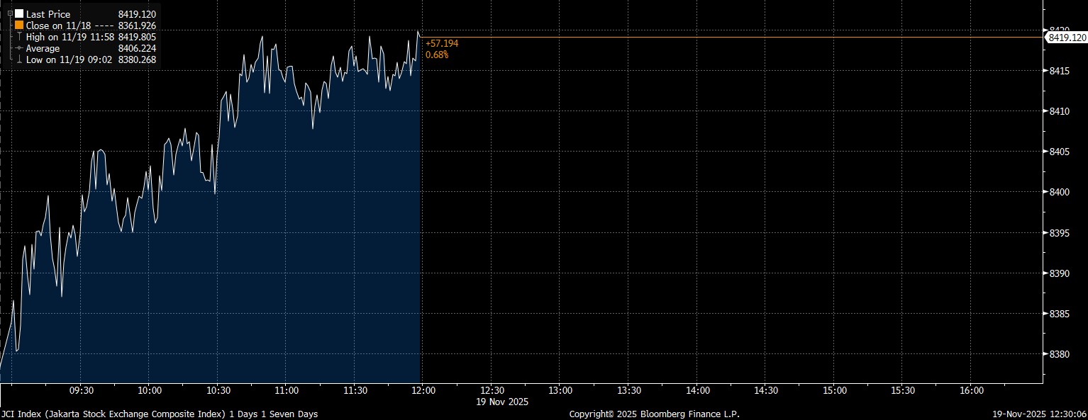Bloomberg Technoz, Jakarta - Indeks Harga Saham Gabungan (IHSG) ditutup menguat 0,68% di posisi 8.419,12 pada penutupan perdagangan Sesi I hari ini, Rabu (19/11/2025). Indeks kembali mencetak rekoor tertinggi sepanjang masa.