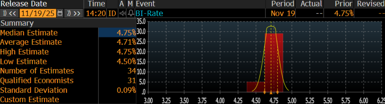 Pasar menantikan pengumuman hasil Rapat Dewan Gubernur (RDG) Bank Indonesia (BI) siang nanti. Konsensus pasar memperkirakan suku bunga acuan bertahan di 4,75% bulan ini.