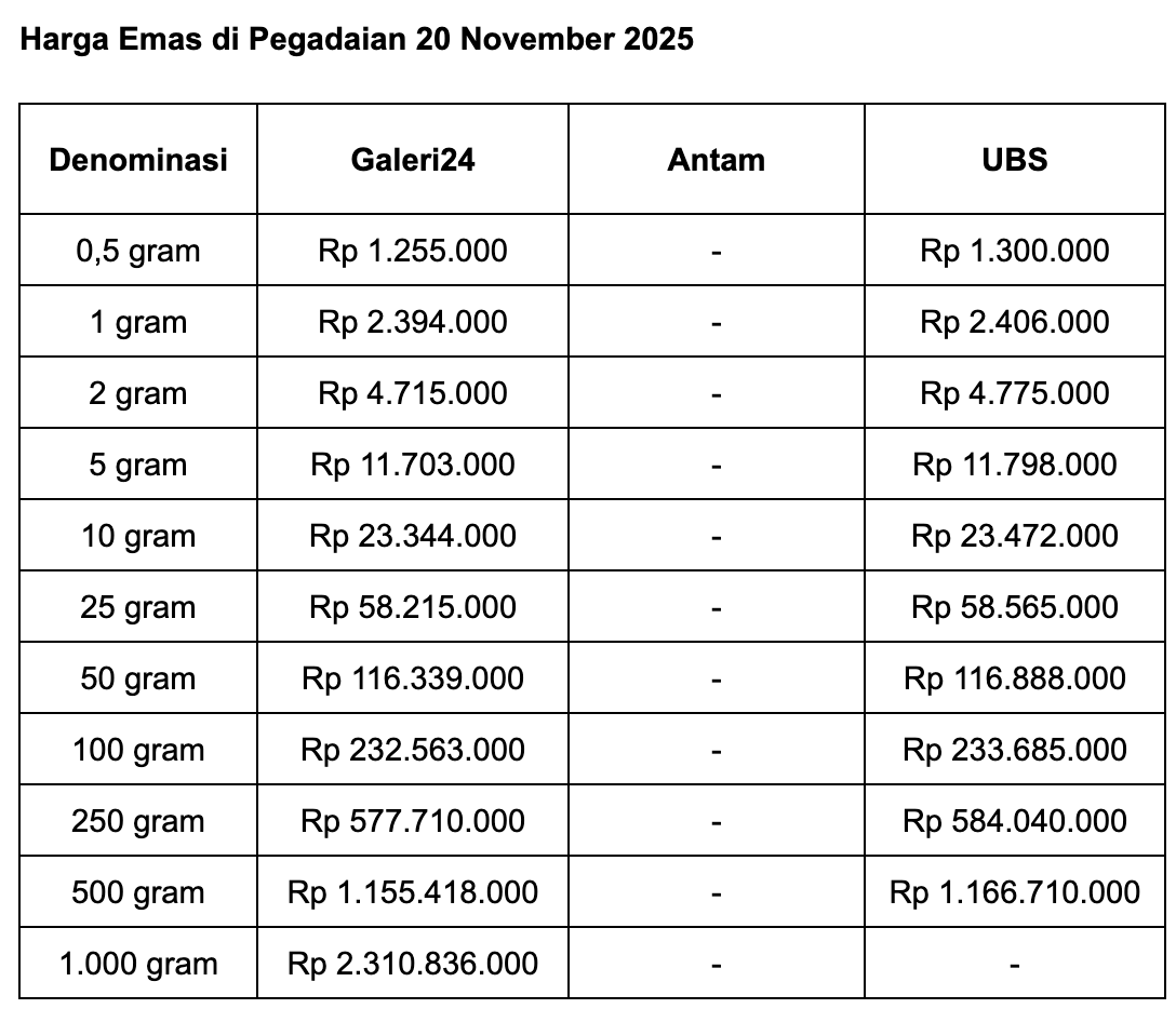 Adapun untuk ukuran 1 gram, harga emas Galeri 24 di Pegadaian adalah Rp 2.394.000. Bertambah Rp 11.000 dalam sehari.