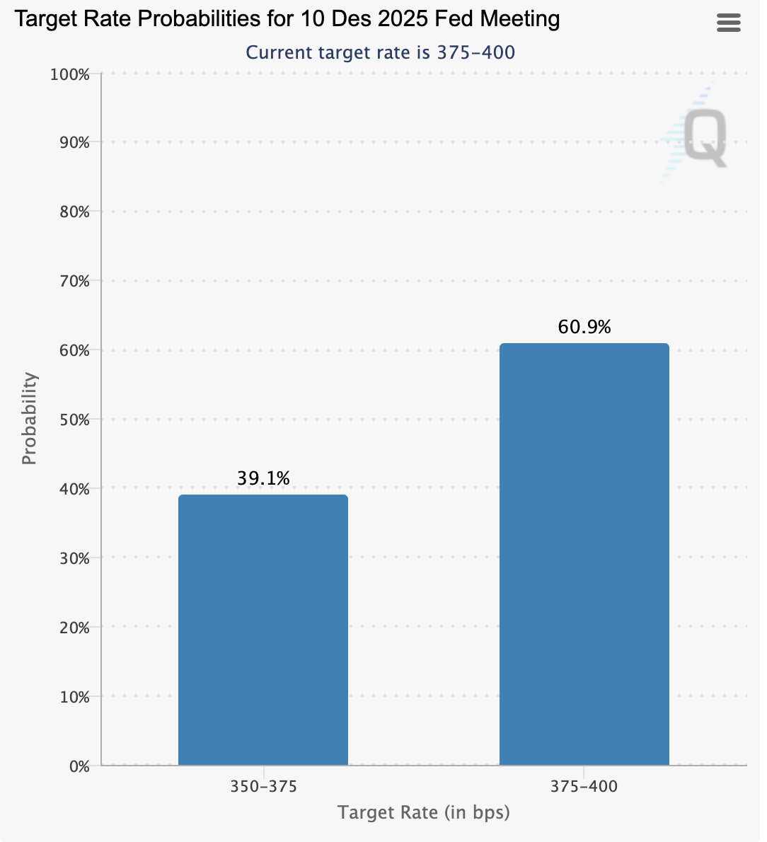 Perlambatan laju harga emas disebabkan oleh pudarnya harapan penurunan suku bunga acuan oleh bank sentral Amerika Serikat (AS) Federal Reserve dalam rapat September. Mengutip CME FedWatch, peluang penurunan Federal Funds Rate sebesar 25 basis poin (bps) pada rapat Desember tinggal 39,1%. Sementara kemungkinan suku bunga acuan ditahan mencapai 60,9%.