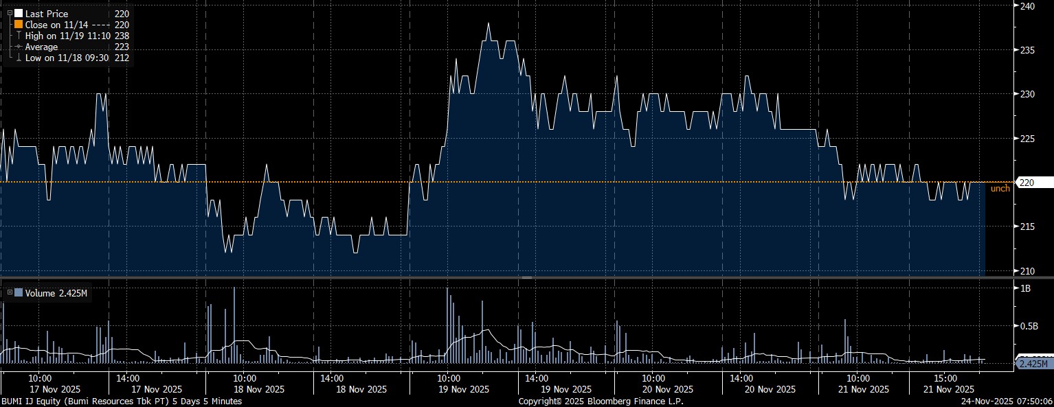 Pada kesempatan yang sama, investor asing mencatat net sell tertinggi pada saham PT Bumi Resources Tbk (BUMI) mencapai Rp677,41 miliar. Bersamaan dengan tekanan jual yang amat masif, saham BUMI melaju stagnan dan stuck di posisi Rp220/saham.