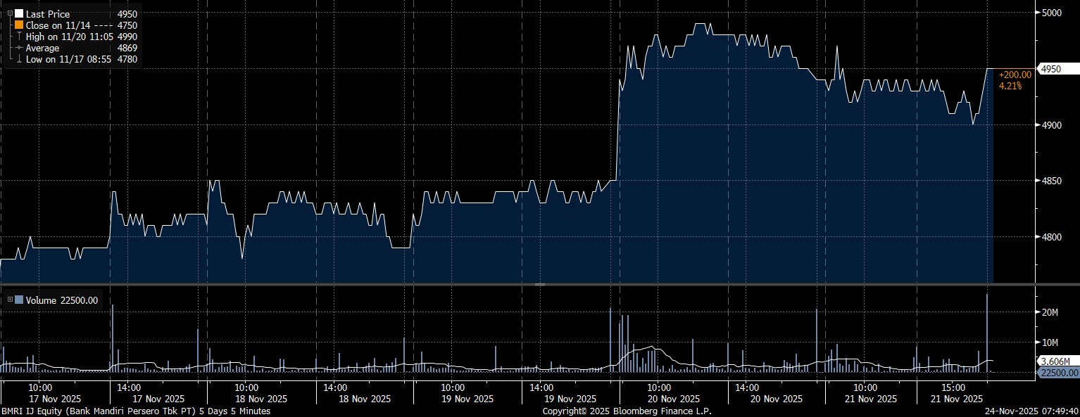 Adapun investor asing tercatat net buy saham terbanyak pada emiten PT Bank Mandiri Tbk (BMRI) mencapai Rp1,45 triliun. Sejalan dengan tren pembelian, saham BMRI menguat 4,2% dalam seminggu ke posisi Rp4.950/saham.