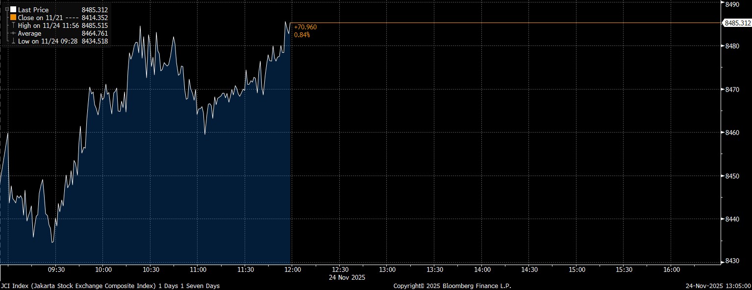 Bloomberg Technoz, Jakarta - Indeks Harga Saham Gabungan (IHSG) berhasil menyentuh rekor tertinggi sepanjang masa atau All Time High (ATH). Pada Senin (24/11/2025), IHSG menutup perdagangan Sesi I dengan kenaikan 0,84% di posisi 8.485 yang merupakan level harga tertinggi penutupan.