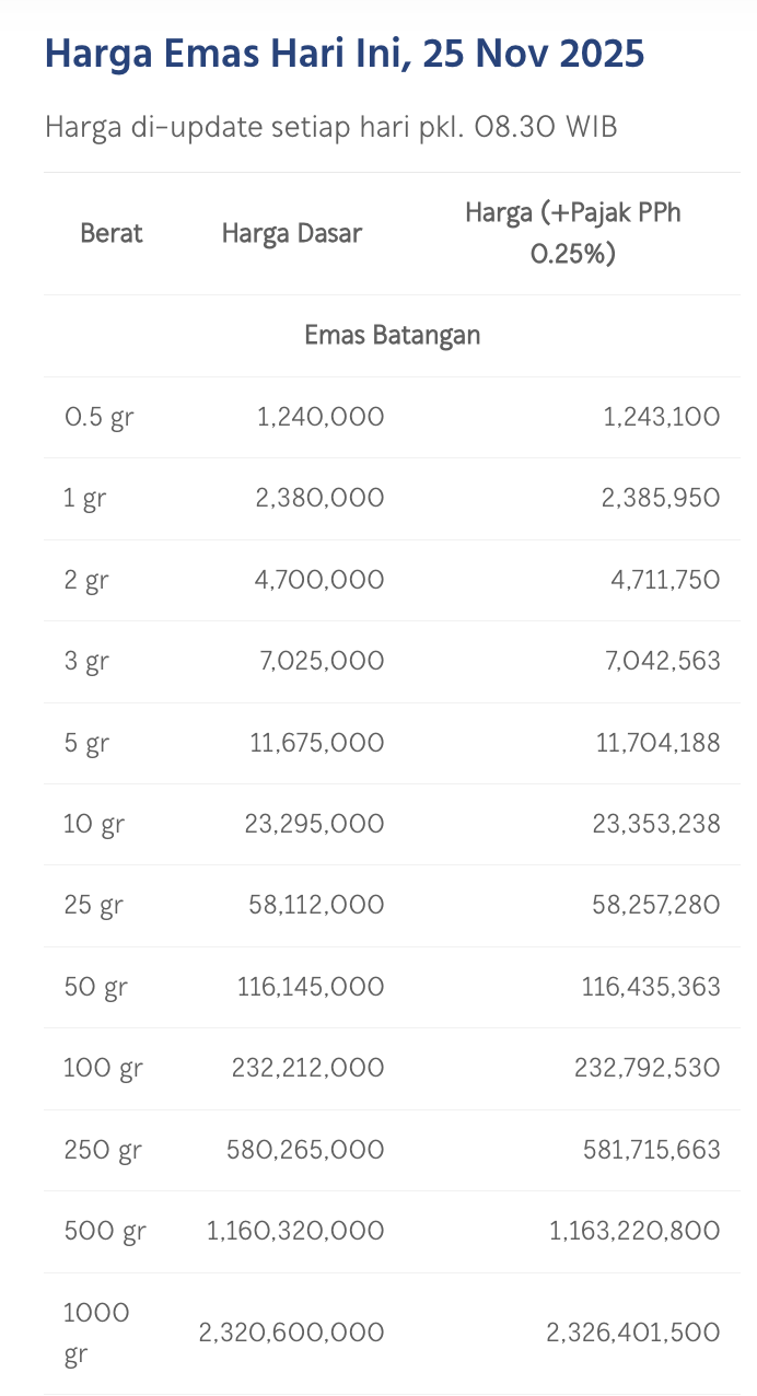 Pada Selasa (25/11/2025), emas Antam dihargai Rp 2.380.000/gram. Naik Rp 40.000 dibandingkan hari sebelumnya.