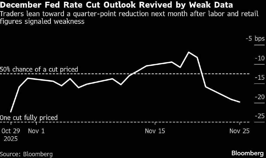 Laporan ekonomi AS yang tertunda semakin memperkuat spekulasi pemotongan suku bunga The Fed pada Desember. Pelaku pasar kini memperkirakan peluangnya sekitar 90%. Penjualan ritel naik moderat pada September, menunjukkan belanja konsumen mulai melambat setelah berbulan-bulan permintaan kuat. Meski inflasi grosir meningkat, kepercayaan konsumen pada November mengalami penurunan tertajam sejak April.