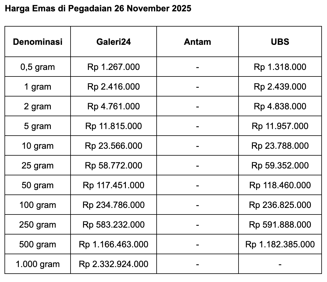 Adapun untuk ukuran 1 gram, harga emas Galeri 24 di Pegadaian adalah Rp 2.416.000. Terangkat Rp 32.000 dalam sehari.