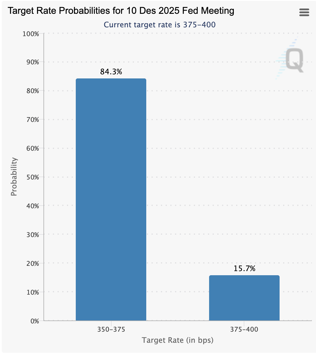 Mengutip CME FedWatch, peluang penurunan Federal Funds Rate sebesar 25 basis poin (bps) menjadi 3,5-3,75% dalam rapat Desember adalah 84,3%. Sementara kemungkinan bertahan di 3,75-4% hanya 15,7%.