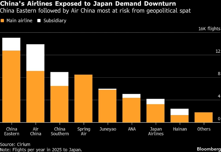 Jumlah penerbangan dari China ke Jepang yang masih dijadwalkan untuk Desember turun lebih dari 20% dibandingkan Oktober. Bhatt memperkirakan lebih dari 50% rute akan dibatalkan hingga akhir tahun.