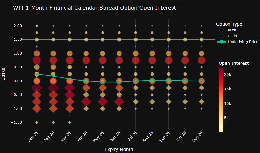 Sebagian kepemilikan terbesar dalam opsi calendar spread satu bulan, jenis kontrak khusus untuk bertaruh pada kondisi kelebihan atau kekurangan pasokan, terkonsentrasi pada spread jangka pendek yang lebih lemah.