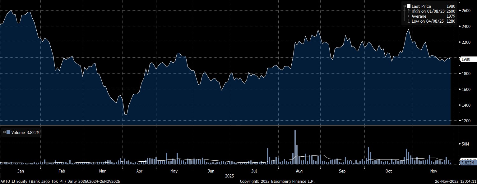 Performa saham ARTO sejauh ini kurang memuaskan. Sepanjang tahun 2025, harganya turun 18,52% year-to-date. Sedang hari ini, harganya turun 15 poin atau melemah 0,75% ke Rp1.980/saham.