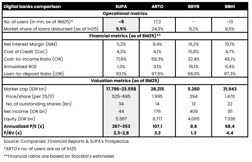 Menyitir riset yang dipublikasikan Stockbit Sekuritas Digital, melalui Stockbit Snips, berdasarkan harga penutupan perdagangan Selasa (25/11/2025), rentang valuasi IPO SUPA secara P/BV berada di bawah saham ARTO dan saham BBHI, biarpun tidak serendah valuasi saham BBYB.
