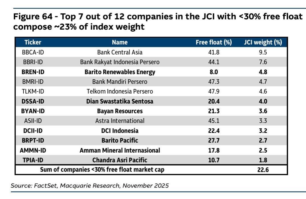 Yang juga menjadi perhatian, mengutip riset Macquarie berdasarkan data saham per November 2025, tujuh dari dua belas perusahaan teratas di IHSG ternyata memiliki free float di bawah 30% hingga membentuk 23% bobot indeks.