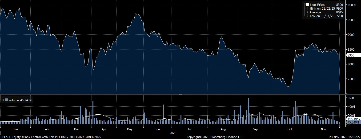 Adapun investor asing paling banyak menjual saham PT Bank Central Asia Tbk (BBCA) mencapai Rp26 triliun lebih. Imbas tekanan jual yang amat masif itu, saham BBCA sepanjang tahun melemah 14,2% ke posisi Rp8.300/saham.