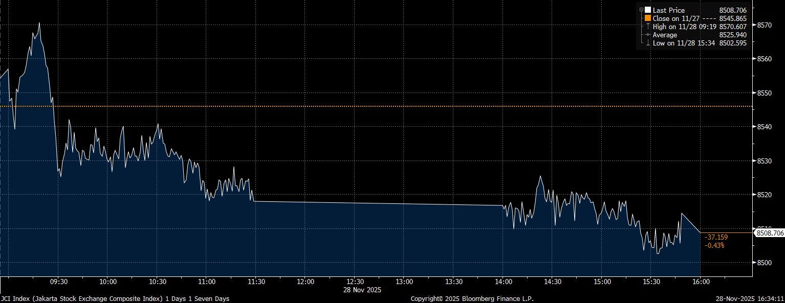 Bloomberg Technoz, Jakarta - Indeks Harga Saham Gabungan (IHSG) ditutup di zona merah dengan pelemahan 0,43% ke 8.508,7 pada perdagangan Jumat (28/11/2025).