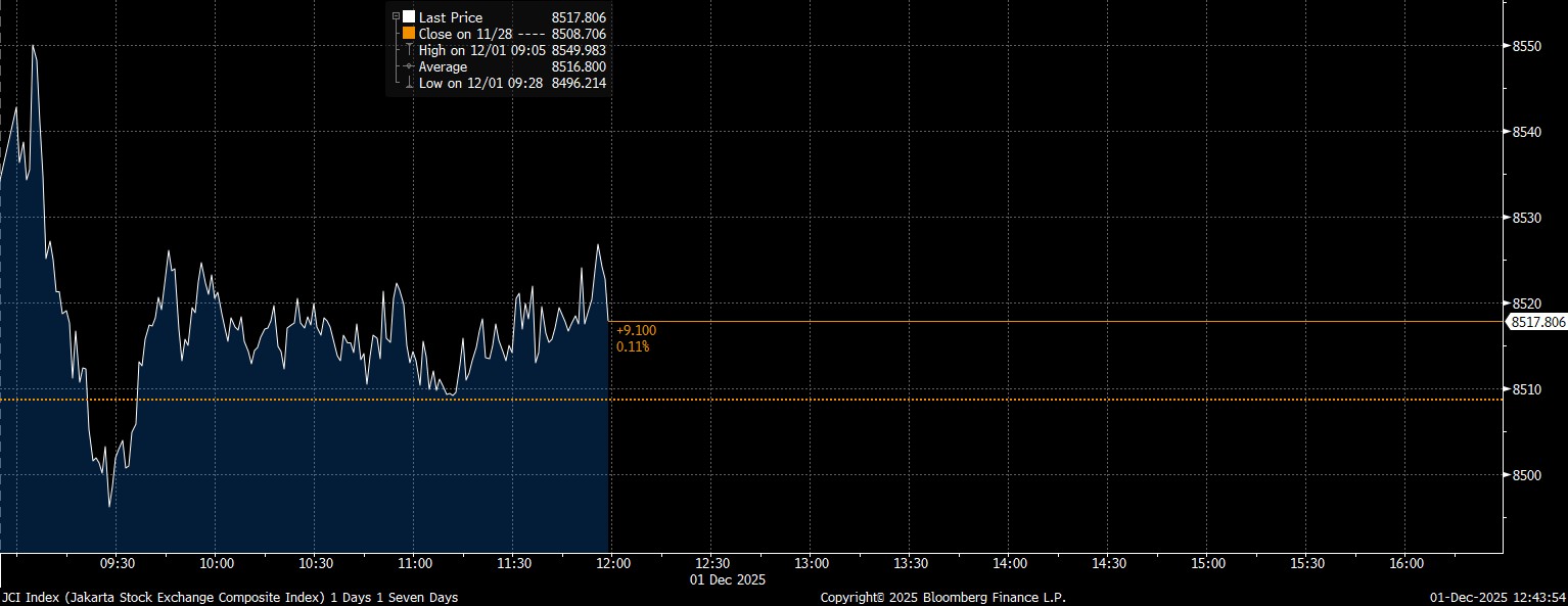 Bloomberg Technoz, Jakarta - Indeks Harga Saham Gabungan (IHSG) ditutup menguat 9,1 poin (0,1%) di posisi 8.517,8 pada perdagangan Sesi I, Senin (1/12/2025). Laju kenaikan IHSG tertahan akibat menyusutnya surplus neraca perdagangan Indonesia ke posisi terendah dalam 6 bulan.
