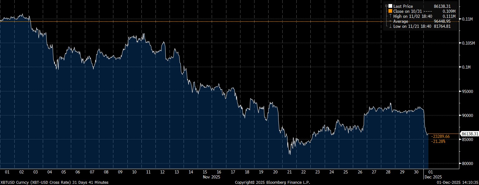 Di sisi berseberangan, Bitcoin (BTC) justru ambles 21,28% sepanjang November sampai dengan dimulai masuknya perdagangan Desember.