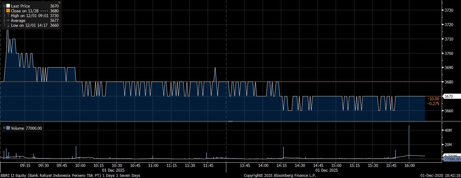 Adapun investor asing net sell yang deras pada saham PT Bank Rakyat Indonesia Tbk (BBRI) mencapai Rp428,2 miliar. Imbas manuver jual, saham BBRI melemah 0,27% dan terpeleset mencapai posisi Rp3.670/saham.