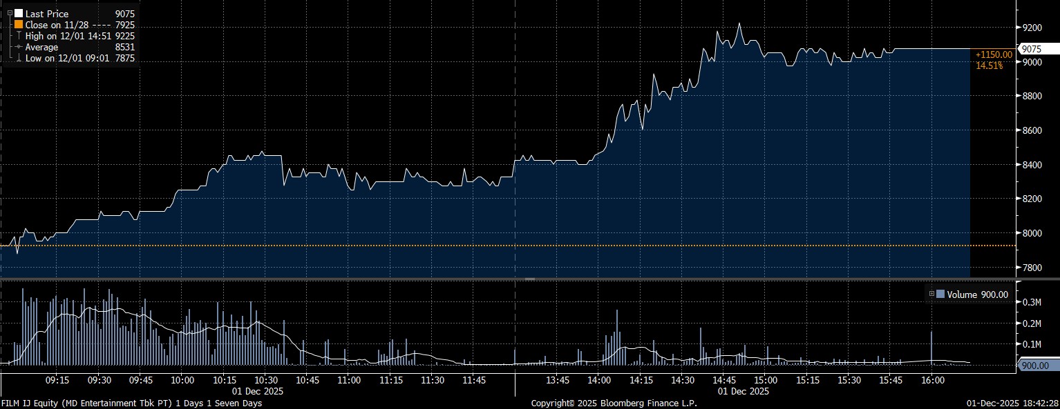 Sedang pada kesempatan yang sama, investor asing mencatat net buy terbesar pada saham PT MD Entertainment Tbk (FILM) mencapai Rp179,9 miliar. Seiringan dengan tren pembelian yang masif, saham FILM melesat 14,5% ditutup di posisi Rp9.075/saham.