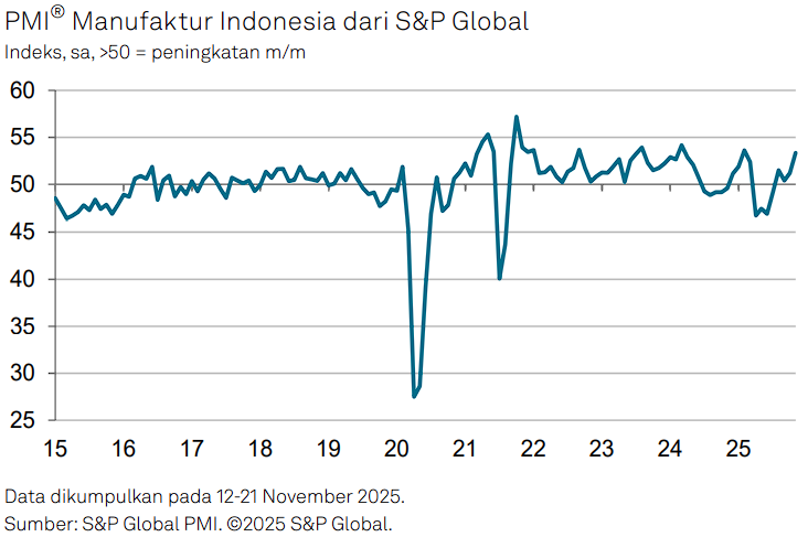 Angka ini lebih tinggi dan jauh lebih optimistis ketimbang Oktober yang sebesar 51,2. PMI di atas 50 menandakan aktivitas yang berada di fase ekspansi.