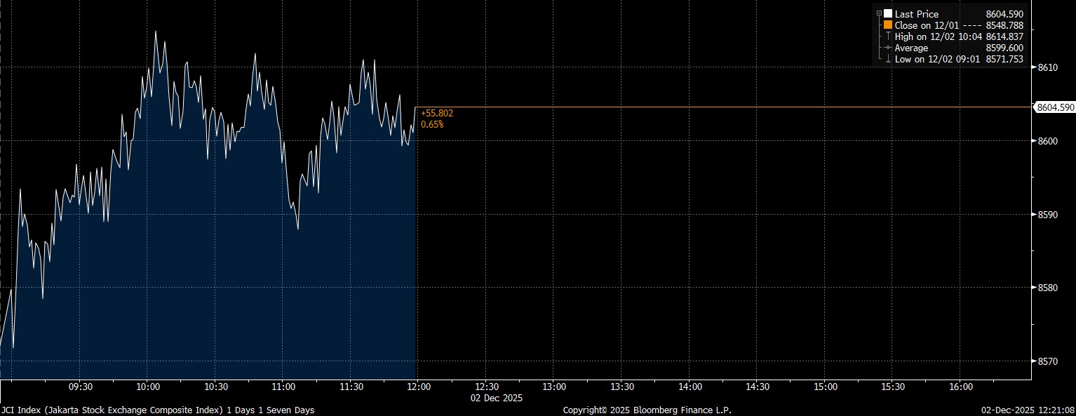 Bloomberg Technoz, Jakarta - Indeks Harga Saham Gabungan (IHSG) pada perdagangan Selasa (2/12/2025) berhasil berada di atas level resistance 8.600. Hingga jeda Sesi I, IHSG mencatat kenaikan 0,65% di posisi 8.604.