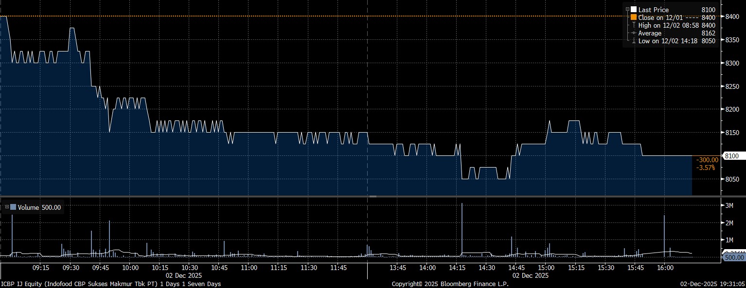 Sedang pada kesempatan yang sama, investor asing net sell yang deras pada saham PT Indofood CBP Sukses Makmur Tbk (ICBP) mencapai Rp210,3 miliar. Imbas manuver jual, saham ICBP melemah 3,57% dan terpeleset mencapai posisi Rp8.100/saham.