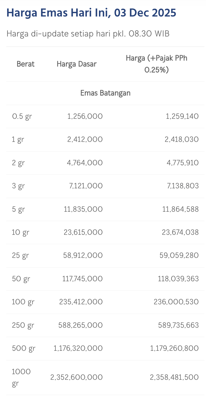 Pada Selasa (2/12/2025), emas Antam dihargai Rp 2.412.000/gram. Turun Rp 13.000 dibandingkan perdagangan hari sebelumnya.