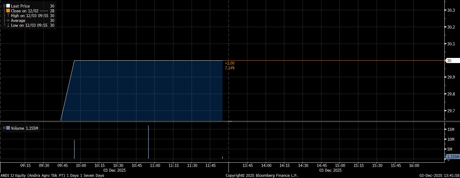 Bloomberg Technoz, Jakarta - Kenaikan harga minyak sawit mentah (Crude Palm Oil/CPO) mengatrol performa emiten CPO yang tercatat di pasar saham Indonesia. Berdasarkan data Bloomberg, saham PT Andira Agro Tbk (ANDI) melesat tertinggi mencapai 7% point–to–point siang ini.