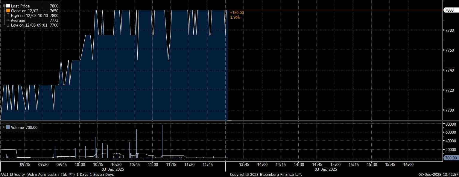- PT Astra Agro Lestari Tbk (AALI) menguat 1,96% ke posisi Rp7.800