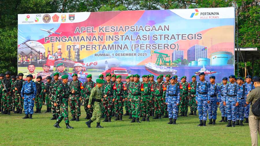 Bloomberg Technoz, Jakarta - PT Pertamina Hulu Rokan (PHR) bekerja sama dengan Tentara Nasional Indonesia (TNI) menggelar Apel Kesiapsiagaan Pengamanan Instalasi Strategis PT Pertamina di Lapangan Masjid Dakwah, Kompleks PHR Rumbai, Senin (1/12/2025). Kegiatan ini merupakan tindak lanjut arahan Kementerian Pertahanan untuk memastikan kesiapsiagaan penuh dalam menjaga instalasi strategis energi nasional.