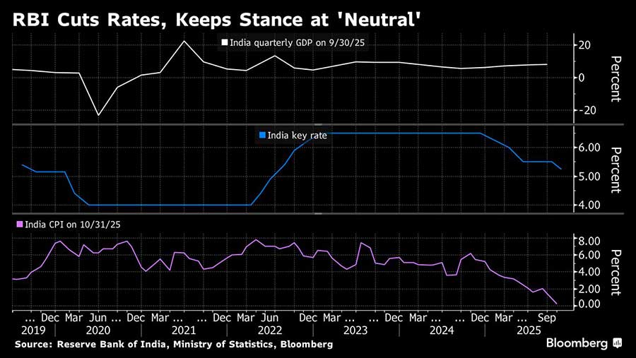 Inflasi melemah menjadi 0,25% pada Oktober, jauh di bawah target 4% bank sentral, mendorong RBI untuk menurunkan proyeksi inflasi untuk tahun fiskal hingga Maret menjadi 2% dari 2,6%. RBI juga menaikkan proyeksi pertumbuhannya untuk periode tersebut menjadi 7,3% dari 6,8% sebelumnya.