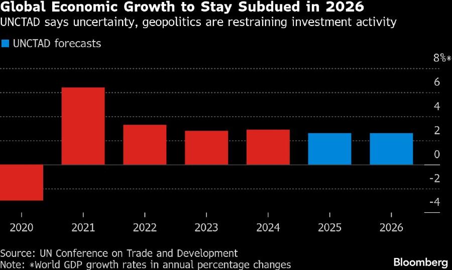 Berdasarkan laporan yang dirilis Konferensi PBB tentang Perdagangan dan Pembangunan (UNCTAD) yang bermarkas di Jenewa, Selasa, pertumbuhan global akan melambat tahun ini menjadi 2,6% dan tetap begitu pada tahun 2026. Setelah tumbuh 2,9% tahun lalu, proyeksi tersebut jika terealisasi akan 0,4 poin persentase lebih rendah daripada rata-rata sebelum pandemi.