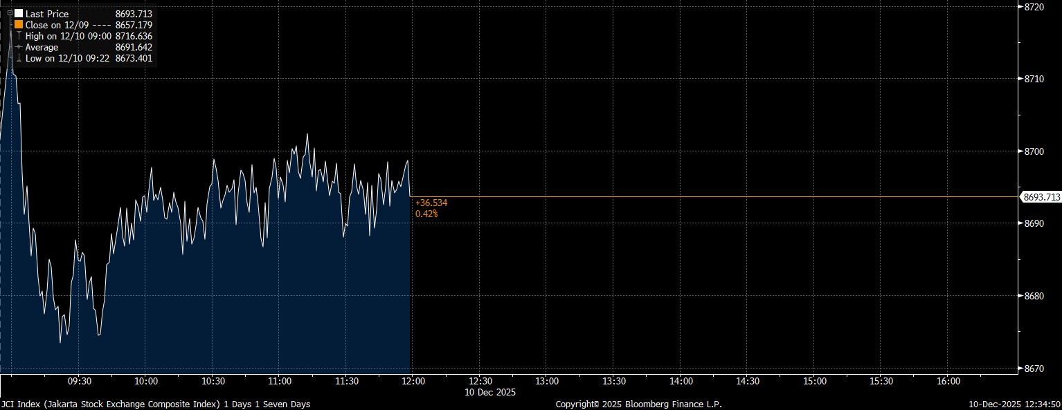 Bloomberg Technoz, Jakarta - Indeks Harga Saham Gabungan (IHSG) ditutup di zona hijau pada perdagangan Sesi I siang hari dengan penguatan 0,42% menuju level 8.693,71 pada Rabu (10/12/2025) menguatnya saham BRPT, BUMI, hingga saham MORA jadi pendorong.