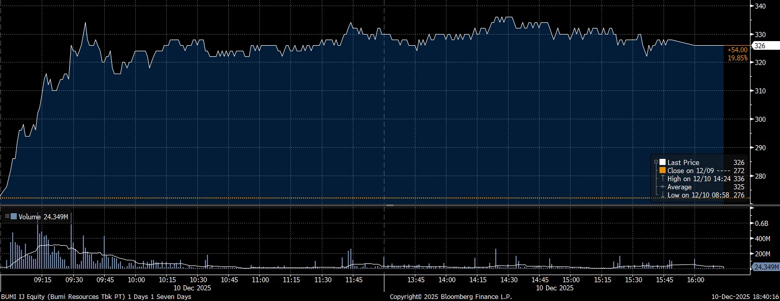 Pada kesempatan yang sama, investor asing mencatat net buy terbesar pada saham PT Bumi Resources Tbk (BUMI) mencapai Rp539,8 miliar. Tersengat pembelian yang deras, saham BUMI menguat 19,85% dan ditutup di posisi Rp326/saham.