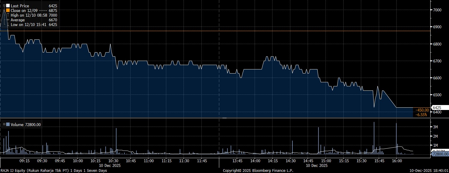 Adapun investor asing net sell yang deras pada saham PT Rukun Raharja Tbk (RAJA) mencapai Rp223,41 miliar. Imbas tekanan dan manuver jual, saham RAJA melemah 6,55% hingga terpeleset di posisi Rp6.425/saham.