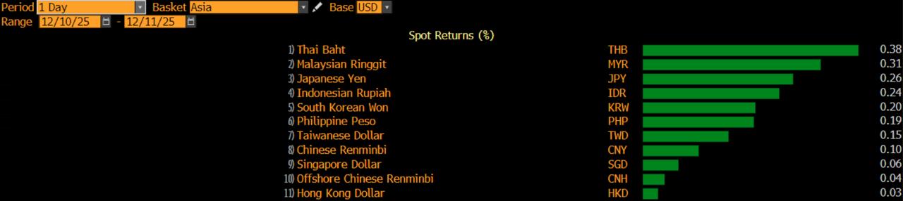 Baht Thailand memimpin penguatan dengan 0,38%. Disusul ringgit Malaysia 0,31%, yen Jepang 0,26%, dan rupiah berada di posisi keempat.