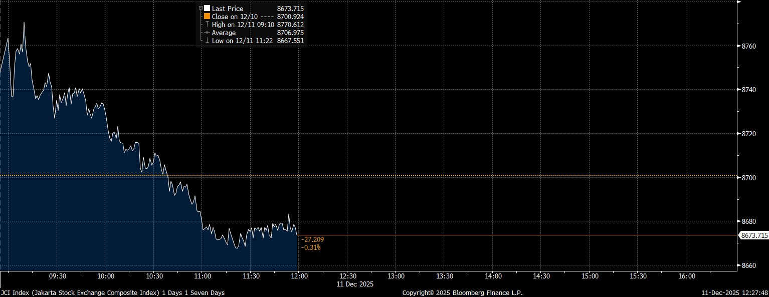 Bloomberg Technoz, Jakarta - Indeks Harga Saham Gabungan (IHSG) balik arah hingga terpeleset di zona merah dengan melemah 0,31% di posisi 8.673,71 pada Sesi I, Kamis (11/12/2025). Jauh berbeda dengan pagi tadi imbas saham–saham big caps yang turun amat dalam.