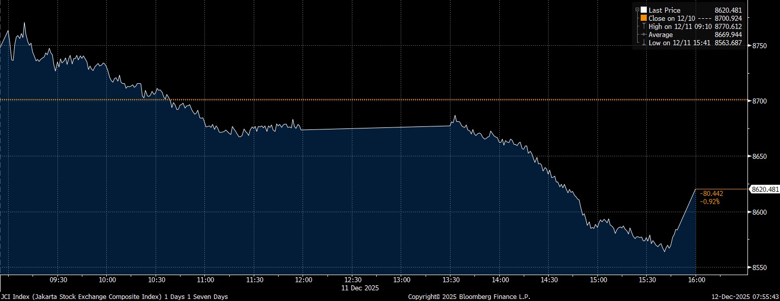 Bloomberg Technoz, Jakarta - Indeks Harga Saham Gabungan (IHSG) pada perdagangan kemarin, Kamis (11/12/2025), ditutup di zona merah. IHSG melemah 0,92% dan ditutup di posisi 8.620,48.