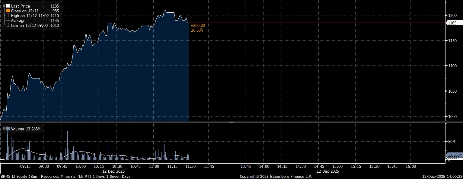 - PT Bumi Resources Minerals Tbk (BRMS) melejit 21,31% ke posisi Rp1.195