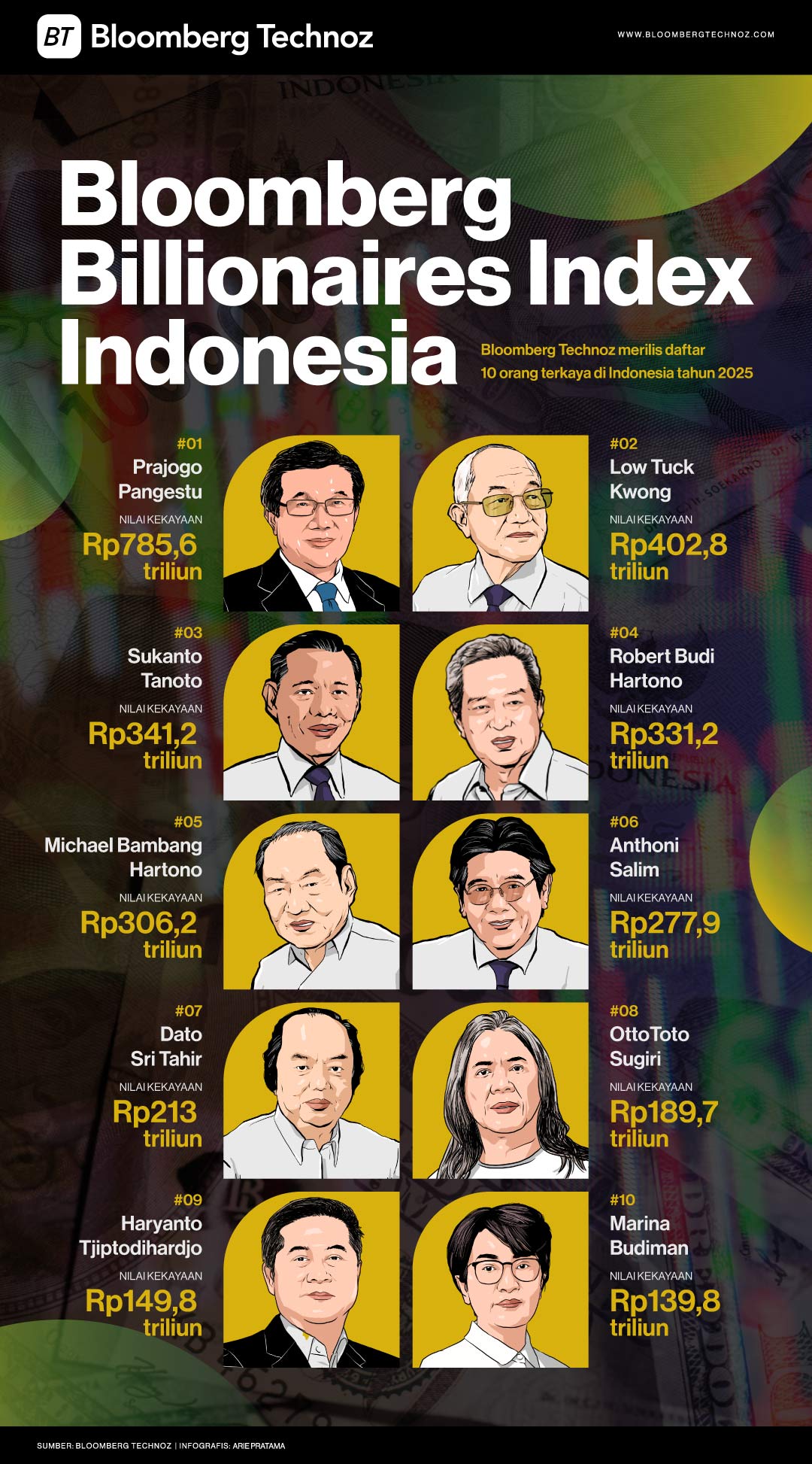 Bloomberg Technoz, Jakarta - Bloomberg Technoz, media ekonomi, bisnis, dan investasi berstandar internasional, kembali merilis daftar terbaru orang terkaya di Indonesia melalui Bloomberg Billionaires Index Indonesia 2025. Edisi terbaru ini menampilkan 10 nama individu terkaya Indonesia selama 2025, berdasarkan metodologi yang diadaptasi dari Bloomberg Billionaires Index global.
