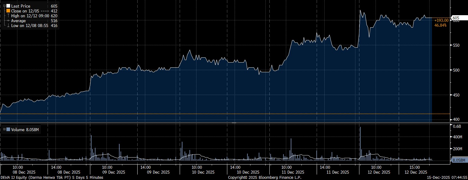 Adapun investor asing tercatat net buy saham terbanyak pada emiten PT Darma Henwa Tbk (DEWA) mencapai Rp728,64 miliar. Bersamaan dengan tren pembelian, saham DEWA menguat 46,84% dalam seminggu ke posisi Rp605/saham.