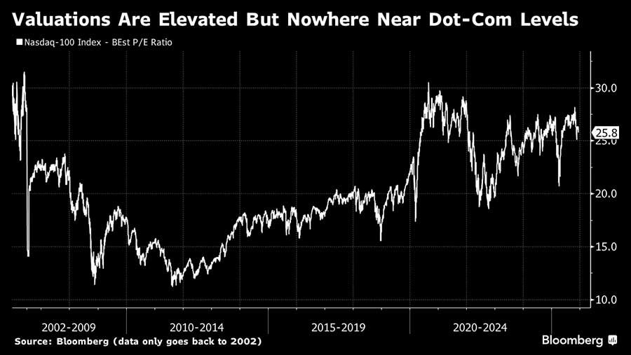 Ambil contoh, Indeks Nasdaq 100 yang didominasi teknologi dihargai 26xlipat dari laba yang diproyeksikan, menurut data yang dikumpulkan oleh Bloomberg. Angka tersebut melebihi 80x lipat pada puncak gelembung dot-com.